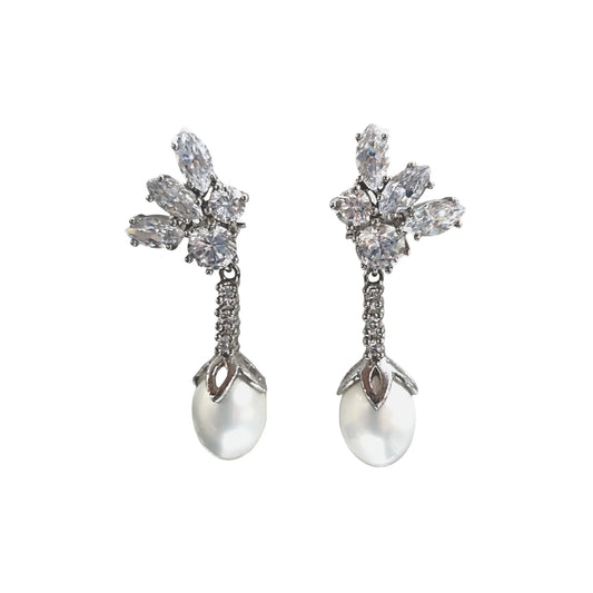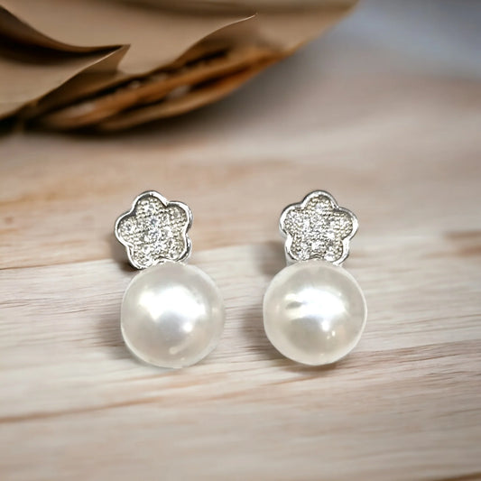 Brincos Perola Prata Flor e Zircónias Brancas